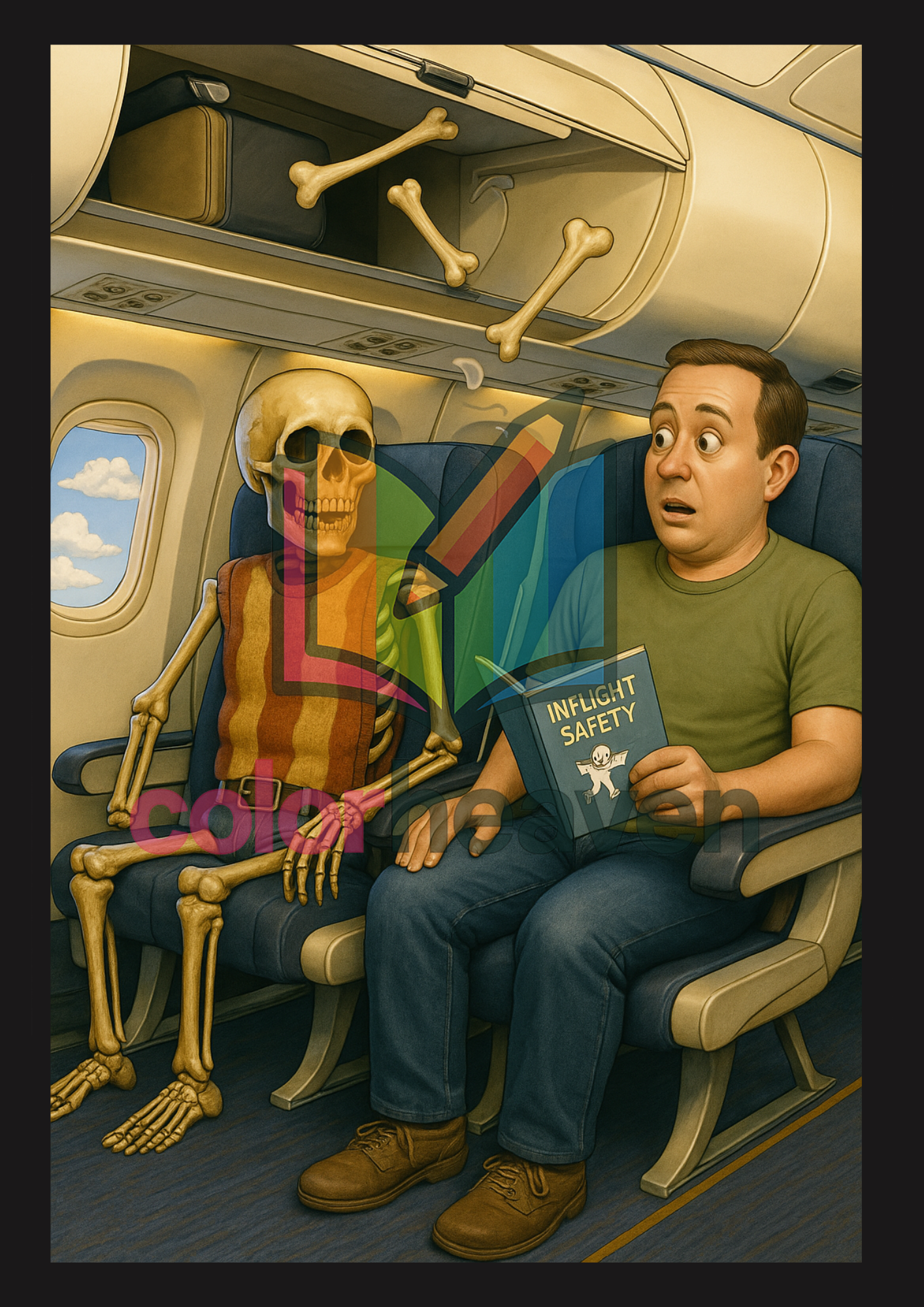 Sitting next to a surprised passenger, who watches as his bones slowly come apart and end up in the overhead compartment. His loose hand is reading the safety booklet.