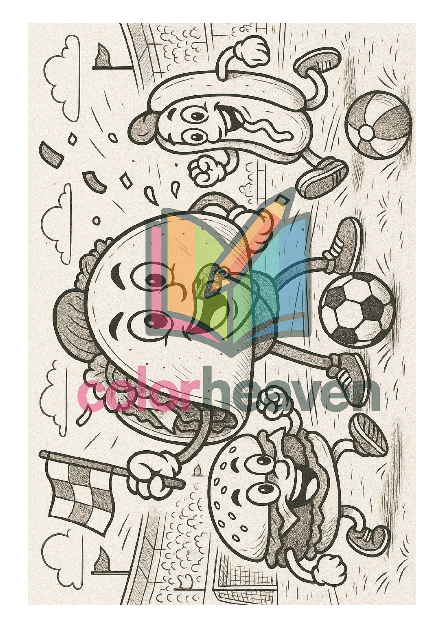 A taco acting as referee at a soccer match between hamburgers and hot dogs