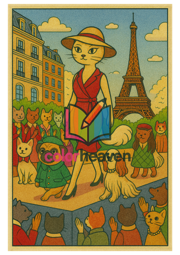 A fashion catwalk in the streets — dogs and cats strutting in elegant Parisian outfits.