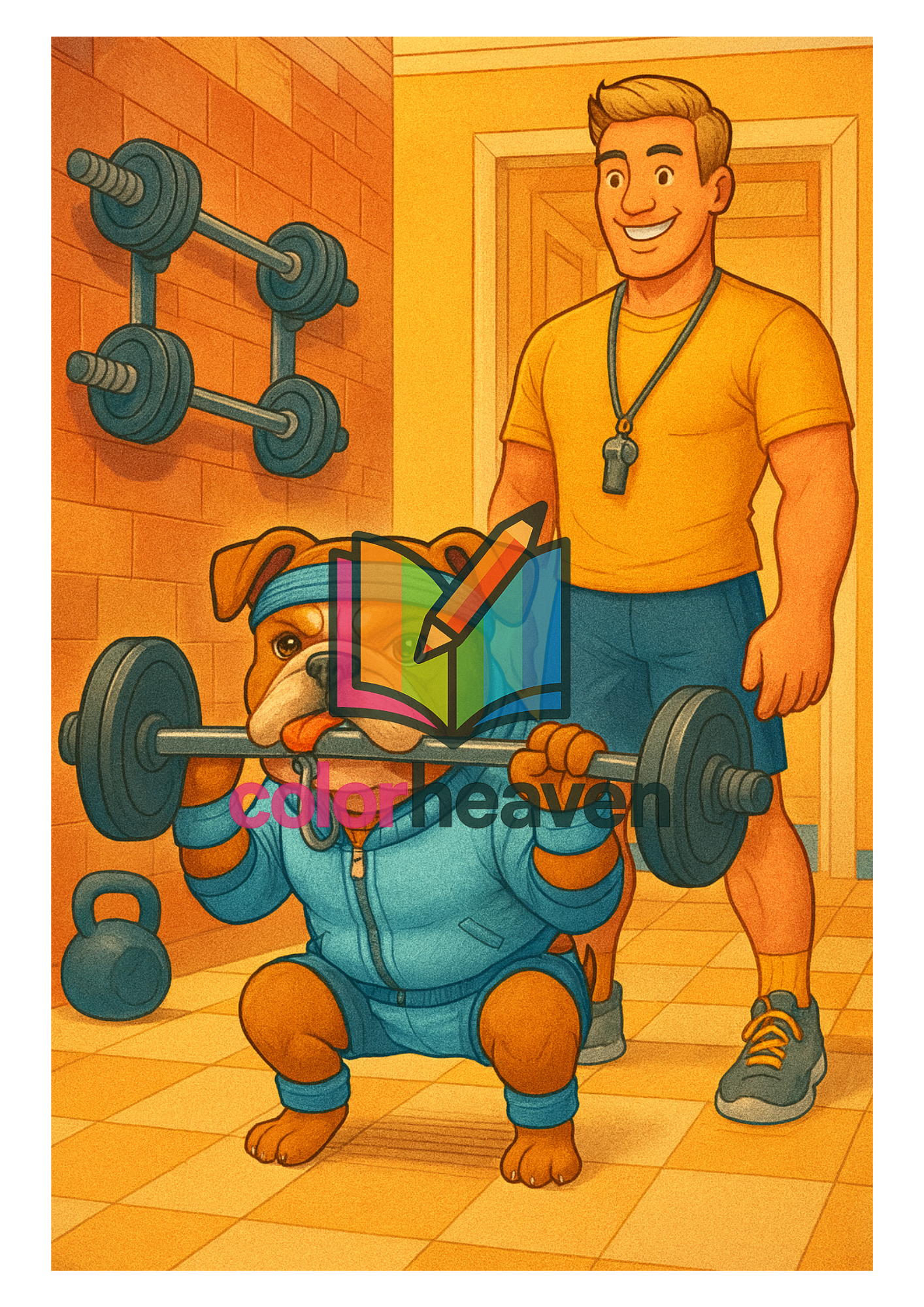 Someone walks in with a “service dog” — but it turns out to be a bulldog in a tiny tracksuit. The dog lifts dumbbells with its mouth and even does squats next to its owner.