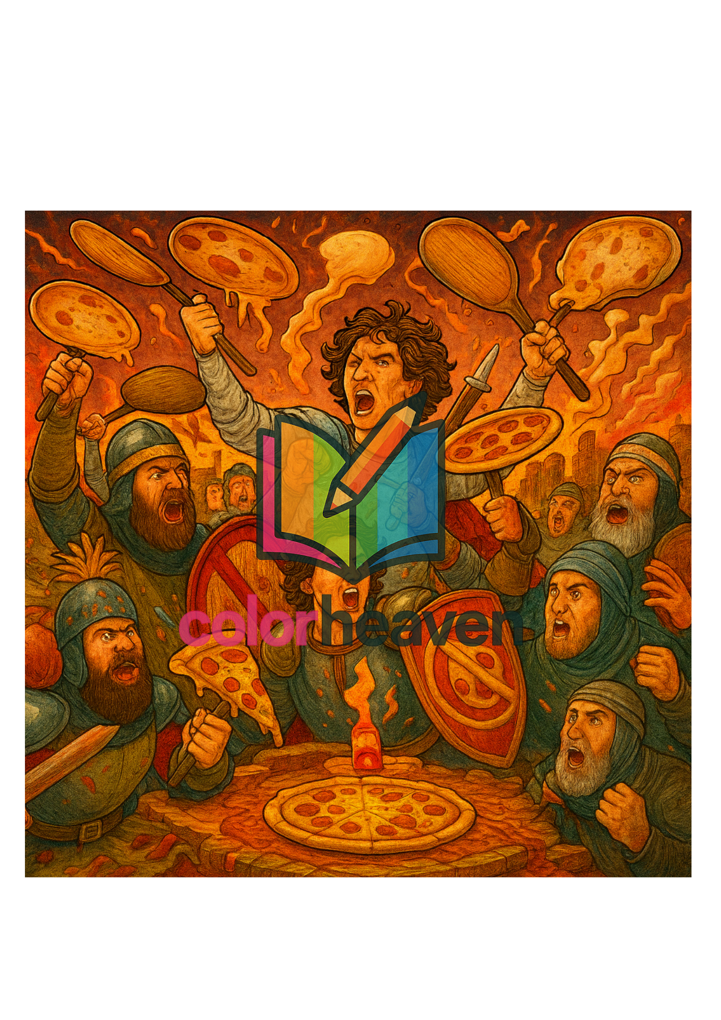 Italians battling over pineapple on pizza — like a medieval war scene with flying dough and molten cheese